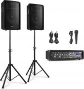 | Produktfarve | Sort | | Afspilningsmuligheder | BT streaming, USB, SD, Mikrofon (indgang) | | Indgangsforbindelser | 3,5 mm Jack, 6,3 mm Jack, SD, USB, XLR (3-pin) | | Udgangsforbindelser | 6,3 mm Jack | | Udgangseffekt: Maks. | 800W | | Udgangseffekt: Højttaler | 500W | | Diameter diskant | 1" | | Diameter bas | 10" | | Magnettype | Ferrit | | Frekvensrespons | 50 - 20.000 Hz | | Impedans | 8 Ohm | | SPL @ 1W/1m | 90dB | | SPL maksimum | 117 dB | | Dimensioner (L x B x H) | 670 x 370 x 689 mm (pakke) | | Dimensioner: Per højttaler | 290 x 340 x 530 mm | | Vægt (kg) | 29,80 | | Vægt: Satellit | 8,1 | | Inkluderede tilbehør | Håndholdt mikrofon (kablet), stativ, højttalerkabel | pdf