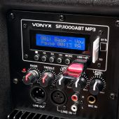 A 10" PA box in a strong ABS cabinet featuring BT-technology, an MP3 player, a high quality 400W mixer/amplifier, an extremely powerful mid-low woofer and a high compression dynamic horndriver for excellent sound reproduction. Unlimited flexibility in placement due to the BT-technology. The MP3 player plays audio files via USB stick or SD card. The line output allows daisy chaining of additional speakers. The durable impact resistant moulded light weight enclosure is complemented with a tough metal grille that protects the woofer. This active unit can be used standalone and is ideal for use in bars, restaurants, small theatres and halls, fitness and conference rooms and on stages.