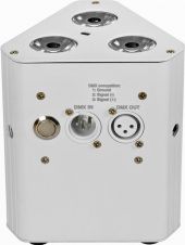 | Power supply: | 100-240 V AC, 50/60 Hz | | Power consumption: | 25 W | | IP classification: | IP20 | | Power connection: | Battery/battery pack Mains input via IEC connector (M) mounting version power supply cord with safety plug (provided) | | Power output: | 1 x IEC connector (F) mounting version | | Battery pack type: | 1 x lithium ion 11.1 V, 4400 mAh, 48.84 Wh | | Battery pack: | Battery operation up to 16h depending on program used Recharging time 3h | | Lamp type: | LED lamp | | LED type: | 3 x 3 W SMD 8072 3in1 TCL RGB (homogenous color mix) | | Flash rate: | 0 - 23 Hz | | DMX channels: | 3; 5; 8 | | DMX input: | 1 x 3-pin XLR (M) mounting version | | DMX output: | 1 x 3-pin XLR (F) mounting version | | Cooling: | Passive convection cooling | | Control: | IR remote control; DMX; QuickDMX; sound to light via microphone; stand-alone | | Preprogrammed in: | Light´J; LED PC-Control 512; Light Captain; EASY SHOW 1; EASY SHOW 2; EASY SHOW 3; Colorchief | | Projection: | Flicker-free | | Carrier frequency: | 2.4 GHz | | Beam angle: | 11° | | Beam angle (1/2 peak): | 11° | | Beam angle (1/10 peak): | 24° | | Housing color: | White | | Display type: | Multicolor LCD display | | Dimensions: | Width: 12.1 cm Depth: 10.8 cm Height: 14.5 cm | | Weight: | 1.30 kg | | Noise classification: | Class 0 (no noise at all) | | Power cord | | | Cable construction: | 3 x 1.0 mm² H05VV-F | | Cable length: | Approx. 1.2 m | | Color: | White | | Remote control | | | Battery: | 1 x button cell 3.0 V CR2032 lithium manganese built-in | | Legal specifications | | | Special product: | Not designed for household room illumination | | Intended use: | Show effect lighting |