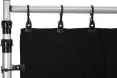 The vertical bars are simply put onto the base plates. Then lock in the telescopic crossbar and attach hush cloth to it with tethers and the stage background is set up.