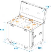 |  | Trunk case with castors | Maximum load: | 100 kg | | Aluminum profile frames: | 30 mm | | Case handle: | 4 pc/pcs | | Stop hinge: | 3 pc/pcs | | Lock: | Butterfly lock: 6 pc/pcs | | Transport aid: | 4 x castors with 2 locking brakes 4 x built-in stacking trays in the cover | | Color: | Black, laminated | | Accessory compartment: | 75 cm x 8.5 cm x 25 cm | | Device compartment: | 26.5 cm x 42.5 cm x 60 cm | | Inside dimensions: | 75 cm x 53 cm x 60 cm | | Material thickness: | 10 mm | | Dimensions: | Width: 81 cm Depth: 59 cm Height: 88 cm | | Weight: | 44.10 kg |
