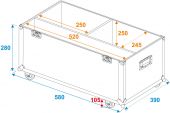 | Maximum load: | 50 kg | | Removable covers: | 1 pc/pcs | | Aluminum profile frames: | 25 mm | | Case handle: | 4 pc/pcs | | Lock: | Butterfly lock: 2 pc/pcs | | Transport aid: | 4 x castors with 2 locking brakes | | Material: | Birch multiplex, 7 mm | | Color: | Black, laminated | | Device compartment: | 25 cm x 24.5 cm x 25 cm | | Accessory compartment: | 51.5 cm x 6.5 cm x 25 cm | | Inside dimensions: | 52 cm x 25 cm | | Dimensions: | Width: 56.5 cm Depth: 38 cm Height: 50 cm | | Weight: | 14.20 kg |