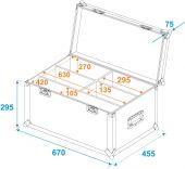 | Maximum load: | 50 kg | | Case handle: | 2 pc/pcs | | Stop hinge: | 2 pc/pcs | | Lock: | Butterfly lock: 2 pc/pcs | | Use of brands: | Branded hardware | | Material: | Birch multiplex | | Color: | Dark brown, laminated | | Device compartment: | 29.5 cm x 13.5 cm x 27 cm | | Accessory compartment: | 63 cm x 10.5 cm x 27 cm | | Inside dimensions: | 63 cm x 42 cm x 27 cm | | Dimensions: | Width: 67 cm Depth: 46 cm Height: 37 cm | | Weight: | 11.00 kg |     |  |  |  | |