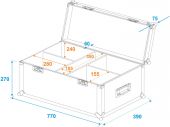 | Maximum load: | 50 kg | | Use of brands: | Branded hardware | | Material: | Birch multiplex, 6.5 mm | | Color: | Dark brown, laminated | | Device compartment: | 28 cm x 15.5 cm x 24 cm | | Inside dimensions: | 66.5 cm x 35 cm x 24 cm | | Accessory compartment: | 10.5 cm x 35 cm x 24 cm | | Weight: | 10.80 kg |     |  |  |  | |
