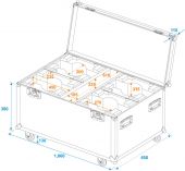 | Aluminum profile frames: | 25 mm | | Case handle: | 4 pc/pcs | | Stop hinge: | 2 pc/pcs | | Lock: | Butterfly lock: 2 pc/pcs | | Transport aid: | 4 x castors with 2 locking brakes 4 x built-in stacking trays in the cover | | Use of brands: | Branded hardware | | Material: | Birch multiplex, 7 mm; birch multiplex | | Color: | Black, laminated; dark brown, laminated | | Device compartment: | 45 cm x 20 cm x 33.5 cm | | Middle compartment: | 10.5 cm x 61 cm x 33.5 cm | | Inside dimensions: | 100.5 cm x 61 cm x 33.5 cm | | Dimensions: | Width: 107 cm Depth: 63 cm Height: 65 cm | | Weight: | 27.55 kg |     |  |  |  | |