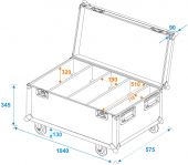 |  | Trunk case with castors | Aluminum profile frames: | 35 mm | | Case handle: | 4 pc/pcs | | Edge mounting handle: | 1 pc/pcs | | Stop hinge: | 3 pc/pcs | | Lock: | Butterfly lock: 2 pc/pcs | | Transport aid: | 4 x castors with 2 locking brakes 4 x built-in stacking trays in the cover | | Color: | Black, laminated | | Device compartment: | 19 cm x 51 cm x 36 cm | | Accessory compartment: | 11 cm x 51 cm x 36 cm | | Material thickness: | 9 mm | | Dimensions: | Width: 105 cm Depth: 57 cm Height: 57 cm | | Weight: | 31.90 kg |     |  |  |  | |