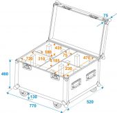 |  | Trunk case with castors | Maximum load: | 100 kg | | Aluminum profile frames: | 30 mm | | Case handle: | 4 pc/pcs | | Stop hinge: | 2 pc/pcs | | Lock: | Butterfly lock: 2 pc/pcs | | Transport aid: | 4 x castors 4 x built-in stacking trays in the cover | | Material: | Plywood multi-layer glued, 7 mm | | Color: | Black, laminated | | Inside dimensions: | 72 cm x 47 cm x 48 cm | | Compartment dimensions: | 30.5 cm x 22.5 cm x 48 cm | | Device compartment: | 18 cm x 22.5 cm x 43.5 cm | | Accessory compartment: | 7.5 cm x 46.5 cm x 24 cm | | Dimensions: | Length: 77 cm Width: 52 cm Depth: 64 cm | | Weight: | 24.70 kg |     |  |  |  | |