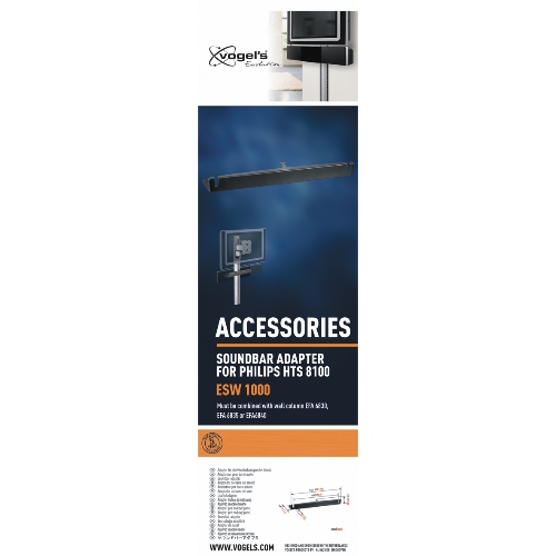Den perfekte kombination er din Philips HTS8100 SoundBar med Ambisound og et Vogel's produkt. Med ESW 1000 kan du montere SoundBar'en på en EFA 6830, EFA 6835 eller EFA 6840. ESW 1000 SoundBar adaptern kan placeres i den ønskede højde på gulvstanderens søjle. Denne adapter kan kombineres med EFA 6825 for at anbringe andet A/V udstyr. Maksimal belastning 10kg.