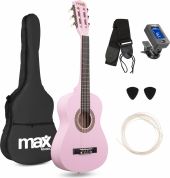 |  | SoloArt Junior 1/4 Classic Guitar Pack er et komplet startsæt til børn, der gerne vil lære at spille klassisk guitar på en sjov og enkel måde. Denne 1/4-størrelse guitar er designet specielt til små hænder og giver en behagelig spilleoplevelse med nylonstrenge, som er blide for fingrene og nemme at trykke ned. Guitaren har en krop af basswood og et gribebræt i ahorn, som sikrer en god klang og stabilt spil. Den klassiske form og pink finish gør guitaren både stilfuld og indbydende for de yngste musikere. Pakken indeholder alt, hvad der er nødvendigt for at komme godt i gang: nylonstrenge, rem, digital tuner, plektre og en nylon gigbag, som gør det nemt at transportere guitaren til øvning, undervisning eller optrædener. Dette sæt er den perfekte introduktion til guitarverdenen for børn mellem 3 og 7 år, og det kombinerer komfort, kvalitet og farverig design i én pakke. - 1/4 klassisk guitar med nylonstrenge