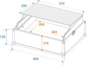 | Maximum load: | 25 kg | | Removable covers: | 1 pc/pcs | | Aluminum profile frames: | 25 mm | | Case handle: | 1 pc/pcs | | Lock: | Butterfly lock: 2 pc/pcs | | Material: | Plywood multi-layer glued, 7 mm | | Color: | Black, laminated | | Compartment dimensions: | 48.3 cm x 45 cm x 11 cm | | Storage area: | 51 cm x 28 cm x | | Front panel width: | 19" | | Mounting height: | Approx. 44.5 cm (10 U) | | Mounting depth: | 110 mm | | Housing design: | 10 U | | Dimensions: | Width: 56 cm Depth: 49 cm Height: 28 cm | | Weight: | 10.10 kg |