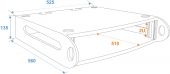 | Maximum load: | 25 kg | | Transport aid: | Rubber feet | | Material: | Plywood multi-layer glued, 9 mm | | Color: | Black, textured coating | | Front panel width: | 19" | | Mounting height: | Approx. 9 cm (2 U) | | Mounting depth: | 500 mm | | Housing design: | 2 U | | Dimensions: | Width: 53 cm Depth: 56 cm Height: 14 cm | | Weight: | 5.30 kg |     |