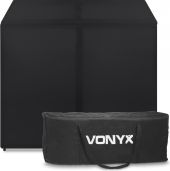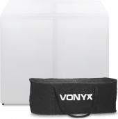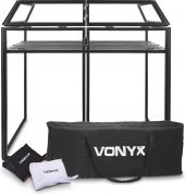 |  | Vonyx DB3 er en sammenklappelig og bærbar letvægts DJ-stand, 1,42 meter bred, og leveres med bæretasker til nem transport og opbevaring. Den har 4 store paneler, der giver front og sider, og en luftet tung metalhylde med 2 udskæringer til kabler. Fødderne kan justeres for at holde DJ-boden stabil på forskellige overflader. Standen er en kombination af en smart aluminiumskonstruktion, der er færdig med Lycra-stof, som sammen giver et robust og elegant udseende. For en ekstra effekt kan du bruge en lys effekt til at oplyse og farve Lycra-panelerne bagfra. Leveres med et hvidt og sort Lycra-cover. - Foldbar perforeret DJ-bord tilknyttet DJ-bås
