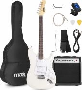 | Tilbudet indeholder følgende: (klik på læs mere for at se produktdetaljer) 1 x El-Guitar pakke med 40W guitar-forstærker, taske, digital-tuner, rem og kabler, Hvid Læs mere 1 x Universal Guitar Stand Læs mere 1 x MSS02 Musiknoder Stativ Sammenklappelig Læs mere