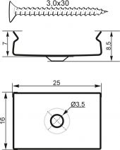 | Diameter mounting holes: | 1 x Ø3mm | | Material: | Metal, 0,5 mm | | Color: | Silver | | Dimensions: | Width: 2,5 cm Depth: 1,6 cm Height: 0,9 cm | | Weight: | 0,01 kg | | Screw | | | Material: | Metal | | Dimensions: | Length: 3 cm Diameter: Ø ,3 cm |  |  |  |  | |