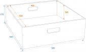 | Maximum load: | 25 kg | | Material: | MDF (medium density fiberboard), 9 mm | | Color: | Black | | Inside dimensions: | 48.5 cm x 52 cm x 16 cm | | Dimensions: | Width: 51 cm Depth: 54 cm Height: 17 cm | | Weight: | 3.70 kg |  |  |  |  | |