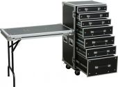 This engineer case has a removable frontlid and 7 drawers of 2,3 and 6U. The height and number of drawers could be classified at one's own discretion. The drawers are lined with hardfoam. The table can also be used as a workbench, and so this article is perfect for technicans on-the-move.