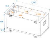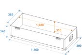 | Maximum load: | 100 kg | | Removable covers: | 1 pc/pcs | | Aluminum profile frames: | 25 mm | | Case handle: | 4 pc/pcs | | Lock: | Butterfly lock: 4 pc/pcs | | Transport aid: | 4 x castors with 2 locking brakes | | Use of brands: | Branded hardware | | Material: | Plywood multi-layer glued; birch multiplex | | Color: | Dark brown, laminated | | Device compartment: | 123.5 cm x 17 cm x 77 cm | | Inside dimensions: | 132 cm x 34 cm x 77 cm | | Width: | Maximum: 124 cm Minimum: 109 cm | | Dimensions: | Width: 136 cm Depth: 38.5 cm Height: 77 cm | | Weight: | 41.60 kg |     |  |  |  | |