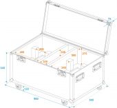 | Maximum load: | 100 kg | | Aluminum profile frames: | 25 mm | | Case handle: | 4 pc/pcs | | Stop hinge: | 2 pc/pcs | | Lock: | Butterfly lock: 2 pc/pcs | | Transport aid: | 4 x castors with 2 locking brakes 4 x built-in stacking trays in the cover | | Use of brands: | Branded hardware | | Material: | Birch multiplex, 7 mm | | Color: | Dark brown, laminated | | Inside dimensions: | 91.5 cm x 50 cm x 31 cm | | Accessory compartment: | 10.5 cm x 50 cm x 35.5 cm | | Device compartment: | 39 cm x 50 cm x 31 cm | | Dimensions: | Width: 97 cm Depth: 54 cm Height: 54 cm | | Weight: | 21.00 kg |     |  |  |  | |
