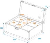| Maximum load: | 25 kg | | Aluminum profile frames: | 25 mm | | Case handle: | 1 pc/pcs | | Stop hinge: | 2 pc/pcs | | Lock: | Butterfly lock: 1 pc/pcs | | Use of brands: | Branded hardware | | Material: | Birch multiplex, 7 mm | | Color: | Dark brown, laminated | | Device compartment: | 14.5 cm x 15.5 cm x 12 cm | | Inside dimensions: | 44 cm x 35 cm x 19.5 cm | | Accessory compartment: | 10 cm x 35 cm x 17 cm | | Dimensions: | Width: 48.5 cm Depth: 39.5 cm Height: 26 cm | | Weight: | 6.20 kg |