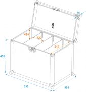| Maximum load: | 25 kg | | Aluminum profile frames: | 30 mm | | Case handle: | 1 pc/pcs | | Stop hinge: | 2 pc/pcs | | Lock: | Butterfly lock: 1 pc/pcs | | Use of brands: | Branded hardware | | Material: | Birch multiplex, 7 mm | | Color: | Dark brown, laminated | | Device compartment: | 12 cm x 31 cm x 43.5 cm | | Inside dimensions: | 48.5 cm x 31 cm x 43.5 cm | | Dimensions: | Width: 53 cm Depth: 35.5 cm Height: 53 cm | | Weight: | 9.50 kg |     |  |  |  | |