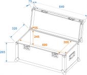| Maximum load: | 50 kg | | Aluminum profile frames: | 30 mm | | Case handle: | 2 pc/pcs | | Stop hinge: | 2 pc/pcs | | Lock: | Butterfly lock: 2 pc/pcs | | Use of brands: | Branded hardware | | Material: | Birch multiplex, 7 mm | | Color: | Dark brown, laminated | | Inside dimensions: | 60 cm x 30 cm x 24.5 cm | | Dimensions: | Width: 64 cm Depth: 34 cm Height: 34 cm | | Weight: | 8.30 kg |     |  |  |