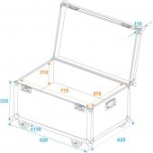 | Maximum load: | 50 kg | | Aluminum profile frames: | 30 mm | | Case handle: | 2 pc/pcs | | Stop hinge: | 3 pc/pcs | | Lock: | Butterfly lock: 2 pc/pcs | | Transport aid: | 4 x castors with 2 locking brakes | | Material: | Plywood multi-layer glued, 9 mm | | Color: | Black, laminated | | Inside dimensions: | 77.5 cm x 57 cm x 31 cm | | Dimensions: | Width: 82 cm Depth: 62 cm Height: 47 cm | | Weight: | 22.80 kg |