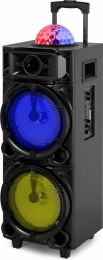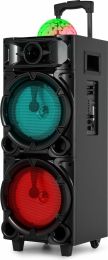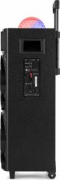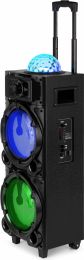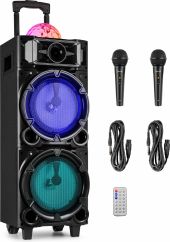 |  | What's a party without light and sound? Take your favourite music anywhere with this Fenton LIVE290 Party speaker equipped with built-in multimedia player. Use smartphone, tablet or other suitable device to connect to the speaker via BT or play music directly via the Aux input, USB or microSD card. The two microphone inputs make doing karaoke really easy and fun, just plug in and go! Light up any party or event with the colourful flashing LED lights on the front and the space-filling disco-ball on top. - Karaoke speaker with spectacular light show