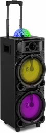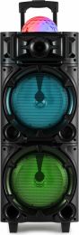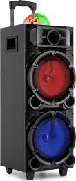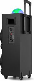 | Product colour | Black | | Playback options | BT streaming, USB, MicroSD, Line input, Microphone (input) | | Input connections | 3.5mm Jack, 6.3mm Jack, MicroSD, USB | | Output power: Max | 300W | | Tweeter type | Piezo | | Diameter tweeter | 1" | | Diameter woofer | 2x 8" | | Voice coil | 1" | | Magnet type | Ferrite | | Frequency response | 50Hz - 18.000Hz | | Impedance | 4 Ohm | | Battery | 3.7V - 3.6Ah | | Power supply | 100-240VAC 50/60Hz | | Dimensions (L x W x H) | 300 x 310 x 840mm | | Weight (kg) | 8,80 | | Included accessories | Handheld microphone (wired), Remote control (wireless), Power cable | pdf