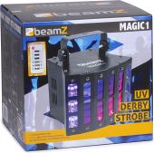 The Magic1 Derby combines the power of 2 effects into 1. The combination of the powerful strobe with the colourful sharp and edgy LED beams are a guaranteed party boost. The pre-programmed shows combined with the master/ slave mode make the Magic1 Derby a good go-to effect for the mobile DJ and entertainer. For the advanced users there is a 7 channel DMX mode with control of each LED and motor, thus making it also very useable for shows or events.