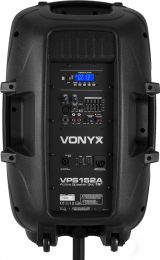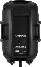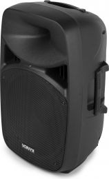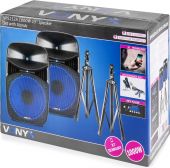 |  | VPS152A er et komplet plug & play sæt, klar til at starte din fest. Sættet indeholder et par 15" højttalere, en passiv og en aktiv model. Den aktive model indeholder forstærkeren, som har en indbygget USB/SD-afspiller og BT trådløs teknologi til at streame din musik fra din smartphone eller tablet. Begge højttalere har en blå LED-ring omkring basenheden for at farvelægge og oplyse din fest. Som en del af sættet medfølger også en kablet mikrofon til karaoke eller præsentationsformål. - 1000W højttalersæt med stativer