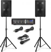| Produktfarve | Sort | | Afspilningsmuligheder | BT streaming, USB, SD, Mikrofon (indgang) | | Indgangsforbindelser | 3,5 mm Jack, 6,3 mm Jack, SD, USB, XLR (3-pin) | | Udgangsforbindelser | 6,3 mm Jack | | Udgangseffekt: Maks. | 800W | | Udgangseffekt: Højttaler | 500W | | Diameter diskant | 1" | | Diameter bas | 10" | | Magnettype | Ferrit | | Frekvensrespons | 50 - 20.000 Hz | | Impedans | 8 Ohm | | SPL @ 1W/1m | 90dB | | SPL maksimum | 117 dB | | Dimensioner (L x B x H) | 670 x 370 x 689 mm (pakke) | | Dimensioner: Per højttaler | 290 x 340 x 530 mm | | Vægt (kg) | 29,80 | | Vægt: Satellit | 8,1 | | Inkluderede tilbehør | Håndholdt mikrofon (kablet), stativ, højttalerkabel | pdf