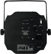| Power supply: | 100-240 V AC, 50/60 Hz | | Power consumption: | 24 W | | IP classification: | IP20 | | Power connection: | Mains input via IEC connector (M) mounting version power supply cord with safety plug (provided) | | Power output: | 1 x IEC connector (F) mounting version | | Lamp type: | LED lamp | | LED type: | 6 x 3 W high-power R/G/B/W/A/P | | DMX channels: | 3; 10 | | DMX input: | 3-pin XLR (M) mounting version | | DMX output: | 3-pin XLR (F) mounting version | | Cooling: | Passive convection cooling | | Control: | Stand-alone; DMX; IR remote control; sound to light via microphone; master/slave function | | Preprogrammed in: | Light´J; LED PC-Control 512; EASY SHOW 1; Light Captain; EASY SHOW 2; Colorchief | | Housing color: | Black | | Attachment system: | Mounting bracket | | Display type: | 4 digit 7-segment LED display | | Material: | Metal | | Dimensions: | Width: 30 cm Depth: 20 cm Height: 31 cm | | Weight: | 3.50 kg | | Noise classification: | Class 2 (slight noise); class 2 (slight noise) | | Power cord | | | Cable construction: | 3 x 0.75 mm² H05VV-F | | Cable length: | Approx. 1.2 m | | Mounting bracket | | | Diameter mounting holes: | 3 x Ø11mm; 4 x Ø5mm | | Material: | Metal, 2 mm | | Remote control | | | Battery: | 1 x button cell 3.0 V CR2025 lithium manganese built-in | | Legal specifications | | | Special product: | Not designed for household room illumination | | Intended use: | Show effect lighting |