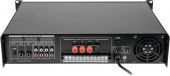 | Power supply: | 230 V AC, 50 Hz | | Power consumption: | 240.00 W | | Protection class: | Protection class I | | Output power: | 120 W RMS | | Power connection: | Fixed power supply cord with safety plug | | Frequency range: | 80 - 16000 Hz | | S/N ratio: | >75 dB microphone >85 dB line | | THD: | <0.5 % at 1 kHz | | Cooling: | Temperature-controlled fan | | Impedance: | Public address systems 100V; 4-16 ohms; Public address systems 70V | | Housing color: | Black | | Zone output: | 6 adjustable zones | | Circuitry: | Class AB | | Controls: | Current limiting; short-circuit; power on/off transient; power on/off transient; Overvoltage; short-circuit | | Status LED: | Power, fault, level meter | | Connections: | Input: microphone via 1 x 3-pin XLR/6.35mm jack (F) combination socket (mounting version) Input: microphone via 2 x 6.3 mm plug (unbal.) Input: line via 3 x stereo RCA 0.3 V Output: line via 1 x stereo RCA Output: speaker via screw terminal | | Equalizer: | Master: 1 x 2-band tone control mono | | Material: | Metal | | Housing design: | (19") 48.3 cm rack installation 2 U | | Dimensions: | Width: 48.3 cm Depth: 38.5 cm Height: 8.9 cm | | Weight: | 9.10 kg | | Remote control | | | Battery: | 1 x button cell 3.0 V CR2025 lithium manganese built-in | | Audio player | | | Control: | IR remote control | | Audio player: | USB + SD | | Display type: | LCD display | | Music format: | MP3 | | Number of files: | Max. 999 | | Available storage media: | USB devices/SD cards max. 32GB (FAT 32) |