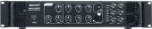 | Power supply: | 230 V AC, 50 Hz | | Power consumption: | 360.00 W | | Protection class: | Protection class I | | Output power: | 180 W RMS | | Power connection: | Fixed power supply cord with safety plug | | Device fuse: | 5 x 20 mm, T 2 A fuse replaceable | | Frequency range: | 80 - 16000 Hz | | S/N ratio: | >75 dB microphone >85 dB line | | THD: | <0.5 % at 1 kHz | | Cooling: | Temperature-controlled fan , air flow from front to rear | | Impedance: | Public address systems 100V; 4-16 ohms; Public address systems 70V | | Zone output: | 6 adjustable zones | | Circuitry: | Class AB | | Control elements: | Power switch, Master control, level control per channel, tone control, regular talkover | | Controls: | Current limiting; short-circuit; power on/off transient; power on/off transient; Overvoltage; short-circuit | | Status LED: | Power, fault, level meter | | Connections: | Input: microphone via 1 x 3-pin XLR/6.35mm jack (F) combination socket (mounting version) Input: microphone via 2 x 6.3 mm plug (unbal.) Input: line via 3 x stereo RCA 0.3 V Output: line via 1 x stereo RCA Output: speaker via screw terminal | | Equalizer: | Master: 1 x 2-band tone control mono | | Material: | Metal | | Color: | Black | | Housing design: | (19") 48.3 cm rack installation 2 U | | Dimensions: | Width: 48.3 cm Depth: 38.5 cm Height: 8.9 cm | | Weight: | 9.30 kg |