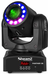 The Panther 35 Spot is a powerful 2-in one lightweight and compact moving head packed with professional features that lighting designers, DJs, or any entertainer can access via on board control or a DMX controller. Featuring seven colours and seven gobos, this spot moving head will deliver a superb light show whether using sound activation, one of the 8 built-in programs or controlling via a DMX controller. The Panther 35 offers 9 or 11 channels of DMX control, a manual focus, 4-Button LED DMX menu, Electronic Dimming (0-100%) and Gobo Shake effect. The controllable 4 section halo ring produces a visual and mesmerising experience of colour changes