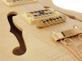 | Pickup: | 2 x humbucker | | Version: | Right hand version | | Neck: | Glued neck made of mahogany, Fingerboard: Blackwood 22 frets | | Body: | 4/4 LP-form, semi-acoustic Mahogany | | Scale length: | 630 mm | | Nut width: | 43 mm | | Number of strings: | 6 | | Regulator: | 2 x volume, 2 x sound | | PU switch: | 1 x 3-way-switch | | Bridge: | Tune-o-matic | | Top: | Maple | | Hardware: | Golden | | Color: | Nature, high-gloss | | Weight: | 3,40 kg | | Body | | | Material: | Limewood |     |  |  |  | |