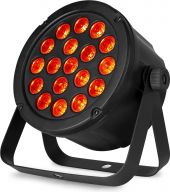 The SlimPAR45 is the largest version of the SlimPAR series. It's equipped with 18 super bright 3W RGB LEDs in a compact casing that can fit almost anywhere. The PAR can be controlled by DMX but can also be used stand-alone or via sound activation. Each colour is individually controllable. There are no internal cooling fans in these PAR cans, which mean absolutely zero noise. It's a perfect effect for mobile DJs, live performances and all other mobile applications but can also be mounted in a fixed light plan for bowling areas, disco, club etc.