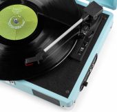 RP111 pladespilleren i kuffertdesign er den perfekte kombination af trendy og retro. Denne stilfuldt designede pladespiller har en nostalgisk finish i læderlook, er let og gør det muligt at lytte til musik uden at tilslutte et højtalersystem takket være det indbyggede stereohøjttalersystem. Det bærbare design og bærehåndtaget gør det muligt at nyde musikken hvor som helst.
