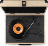 Enjoy the authentic sound of vinyl using this Audizio RP116 record player. This stylish briefcase, covered in a PU leather finish, is lightweight and allows listening to music without having to connect it to a speaker system. Connects wirelessly to speakers, headphones and other devices equipped with BT wireless technology or to wired audio systems and powered speakers. With the built-in BT receiver, digital music can also be streamed wirelessly from a smartphone, tablet PC or other BT compatible device and can be listened to via the stereo speakers.