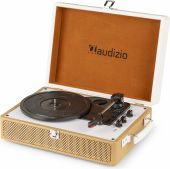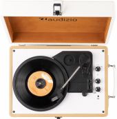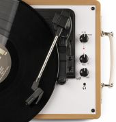 Play your vinyl on this stylishly designed RP119 record player. This high quality vintage style turntable is covered with a stylish PU leather finishing combined with a luxurious gold-coloured speaker grill. The RP119 connects wirelessly to speakers, headphones and other devices equipped with BT wireless technology or to wired audio systems and powered speakers. The built-in BT receiver also allows you to wirelessly stream digital music from a smartphone, tablet PC or other BT-compatible device and listen to it via the stereo speakers built into the turntable.