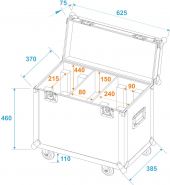 | Maximum load: | 50 kg | | Aluminum profile frames: | 30 mm | | Case handle: | 2 pc/pcs | | Stop hinge: | 2 pc/pcs | | Lock: | Butterfly lock: 2 pc/pcs | | Transport aid: | Castors 4 x built-in stacking trays in the cover | | Material: | Plywood multi-layer glued, 7 mm | | Color: | Black, laminated | | Compartment dimensions: | 24 cm x 33.5 cm x 44 cm | | Accessory compartment: | 8 cm x 33.5 cm x 15 cm | | Inside dimensions: | 56 cm x 33.5 cm x 44 cm | | Dimensions: | Width: 62.5 cm Depth: 38.5 cm Height: 64 cm | | Weight: | 18.30 kg |     |  |  |  | |