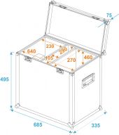 | Maximum load: | 50 kg | | Aluminum profile frames: | 30 mm | | Case handle: | 2 pc/pcs | | Carrying handle: | 1 pc/pcs | | Stop hinge: | 2 pc/pcs | | Lock: | Butterfly lock: 2 pc/pcs | | Material: | Birch multiplex, 7 mm | | Color: | Dark brown, laminated | | Device compartment: | 23 cm x 27 cm x 46 cm | | Middle compartment: | 10.5 cm x 29 cm x 46 cm | | Inside dimensions: | 64 cm x 29 cm x 46 cm | | Dimensions: | Width: 68.5 cm Depth: 33.5 cm Height: 57 cm | | Weight: | 13.50 kg |     |  |  |  | |