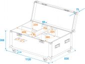| Maximum load: | 100 kg | | Aluminum profile frames: | 25 mm | | Case handle: | 4 pc/pcs | | Stop hinge: | 3 pc/pcs | | Lock: | Butterfly lock: 2 pc/pcs | | Transport aid: | 4 x castors with 2 locking brakes 4 x built-in stacking trays in the cover | | Use of brands: | Branded hardware | | Material: | Birch multiplex, 7 mm | | Color: | Dark brown, laminated | | Accessory compartment: | 9 cm x 79 cm x 23.5 cm | | Device compartment: | 48 cm x 22.5 cm x 23.5 cm | | Inside dimensions: | 105 cm x 79 cm x 23.5 cm | | Dimensions: | Width: 112 cm Depth: 50 cm Height: 84 cm | | Weight: | 28.90 kg |     |  |  |  | |