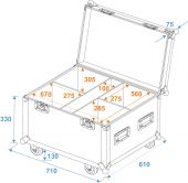 | Maximum load: | 100 kg | | Aluminum profile frames: | 30 mm | | Case handle: | 4 pc/pcs | | Stop hinge: | 2 pc/pcs | | Lock: | Butterfly lock: 2 pc/pcs | | Transport aid: | 4 x castors with 2 locking brakes 4 x built-in stacking trays in the cover | | Use of brands: | Branded hardware | | Material: | Birch multiplex, 7 mm | | Color: | Dark brown, laminated | | Device compartment: | 27 cm x 27 cm x 28 cm | | Accessory compartment: | 10 cm x 56 cm x 28 cm | | Inside dimensions: | 65 cm x 55 cm x 30.5 cm | | Dimensions: | Length: 71 cm Width: 60 cm Height: 53 cm | | Weight: | 20.20 kg |