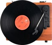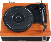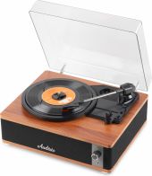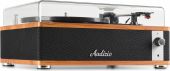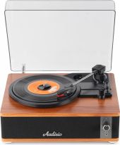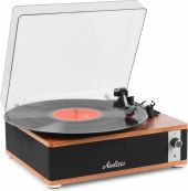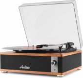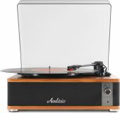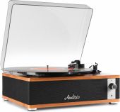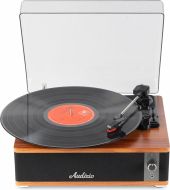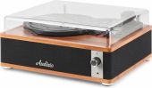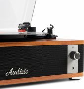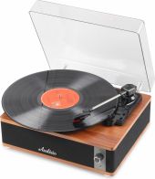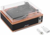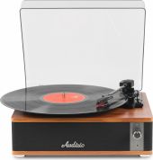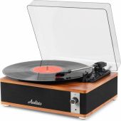 Experience the warm, authentic sound of vinyl with the Audizio Irvine turntable, featuring built-in full-range stereo speakers. With the integrated BT receiver, you can easily stream your favorite digital music wirelessly from a smartphone, tablet, or any other BT-compatible device. The Irvine boasts a stylish, hand-crafted wooden housing and a removable transparent dust cover for extra protection. Its compact design makes it easy to place anywhere or take along when needed; a perfect fusion of classic vinyl enjoyment and modern convenience.