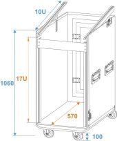 | Maximum load: | 100 kg | | Removable covers: | 3 pc/pcs | | Aluminum profile frames: | 30 mm | | Case handle: | 4 pc/pcs | | Lock: | Butterfly lock: 5 pc/pcs | | Transport aid: | 4 x castors with 2 locking brakes | | Material: | Plywood multi-layer glued, 9 mm | | Color: | Black, laminated | | Front panel width: | 19" | | Mounting height: | Top with adjustable tilt angle approx. 44.5 cm (10 U) Front approx. 75.5 cm (17 U) | | Mounting depth: | 570 mm | | Housing design: | 17 U | | Dimensions: | Width: 55 cm Depth: 61.5 cm Height: 103.5 cm | | Weight: | 34.20 kg |     |  |  |