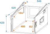 | Maximum load: | 50 kg | | Removable covers: | 1 pc/pcs | | Aluminum profile frames: | 30 mm | | Case handle: | 2 pc/pcs | | Lock: | Butterfly lock: 5 pc/pcs with shut-off function | | Material: | Plywood multi-layer glued, 9 mm | | Color: | Black, laminated | | Plate: | 33 cm x 39 cm | | Front panel width: | 19" | | Mounting height: | Front approx. 26.5 cm (6 U) Top with adjustable tilt angle approx. 44.5 cm (10 U) | | Mounting depth: | 450 mm | | Housing design: | 6 U | | Dimensions: | Width: 55 cm Depth: 61 cm Height: 51 cm | | Weight: | 17,00 kg |