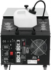 | Power supply: | 230 V AC, 50 Hz | | Power consumption: | 1050 W | | IP classification: | IP20 | | Power connection: | Mains input via IEC connector (M) mounting version power supply cord with safety plug (provided) | | Warm-up time: | Approx. 4.5 min | | Output distance: | Approx. 6 m | | Tank capacity: | 2.5 l water-based fluid removable tank | | Fluid consumption: | Approx. 25 ml/min | | DMX channels: | 1 | | DMX input: | 1 x 3-pin XLR (M) mounting version | | DMX output: | 1 x 3-pin XLR (F) mounting version | | Control: | DMX; wired remote control | | Housing color: | Silver | | Color: | Silver | | Dimensions: | Width: 36 cm Depth: 54 cm Height: 51 cm | | Weight: | 24.40 kg |     |  |  |  | |