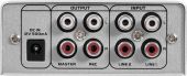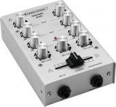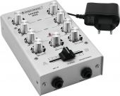 | Power supply: | 100-240 V AC, 50/60 Hz 12V 500 mA | | Pin configuration: | Inside + / outside - | | Power consumption: | 6.00 W | | Protection class: | Protection class III | | Power connection: | Mains input via coaxial power connector (M) mounting version power supply cord with AC adapter (provided) | | Frequency range: | 20 - 20000 Hz | | S/N ratio: | >85 dB | | THD: | <0.5 % at 1 kHz | | Housing color: | Silver | | Control elements: | Crossfader | | Status LED: | Power | | Connections: | Input: line via 2 x stereo RCA Input: microphone via 1 x 6.3 mm plug (unbal.) Output: master via 1 x stereo RCA Output: rec. via 1 x stereo RCA Output: headphones via 1 x 6.3 mm jack socket (stereo) mounting version | | Channels: | Input chanel: 2 x stereo via RCA, channel control via rotary dial, 2-band tone control EQ Microphon chanal: 1 x mono via jack, channel control via rotary dial Master output: 1 x stereo via RCA, channel control via rotary dial Headphones output: , channel control via rotary dial | | Housing design: | Desktop console housing | | Dimensions: | Width: 10 cm Depth: 16.5 cm Height: 6 cm | | Weight: | 0.50 kg |