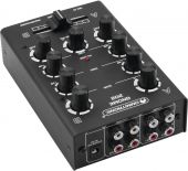 | Power supply: | 100-240 V AC, 50/60 Hz 12V 500 mA | | Pin configuration: | Inside + / outside - | | Power consumption: | 6.00 W | | Protection class: | Protection class III | | Power connection: | Mains input via coaxial power connector (M) mounting version power supply cord with AC adapter (provided) | | Frequency range: | 20 - 20000 Hz | | S/N ratio: | >85 dB | | THD: | <0.5 % at 1 kHz | | Housing color: | Black | | Control elements: | Crossfader | | Status LED: | Power | | Connections: | Input: line via 2 x stereo RCA Input: microphone via 1 x 6.3 mm plug (unbal.) Output: master via 1 x stereo RCA Output: rec. via 1 x stereo RCA Output: headphones via 1 x 6.3 mm jack socket (stereo) mounting version | | Channels: | Input chanel: 2 x stereo via RCA, channel control via rotary dial, 2-band tone control EQ Microphon chanal: 1 x mono via jack, channel control via rotary dial Master output: 1 x stereo via RCA, channel control via rotary dial Headphones output: , channel control via rotary dial | | Housing design: | Desktop console housing | | Dimensions: | Width: 10 cm Depth: 16.5 cm Height: 6 cm | | Weight: | 0.50 kg |